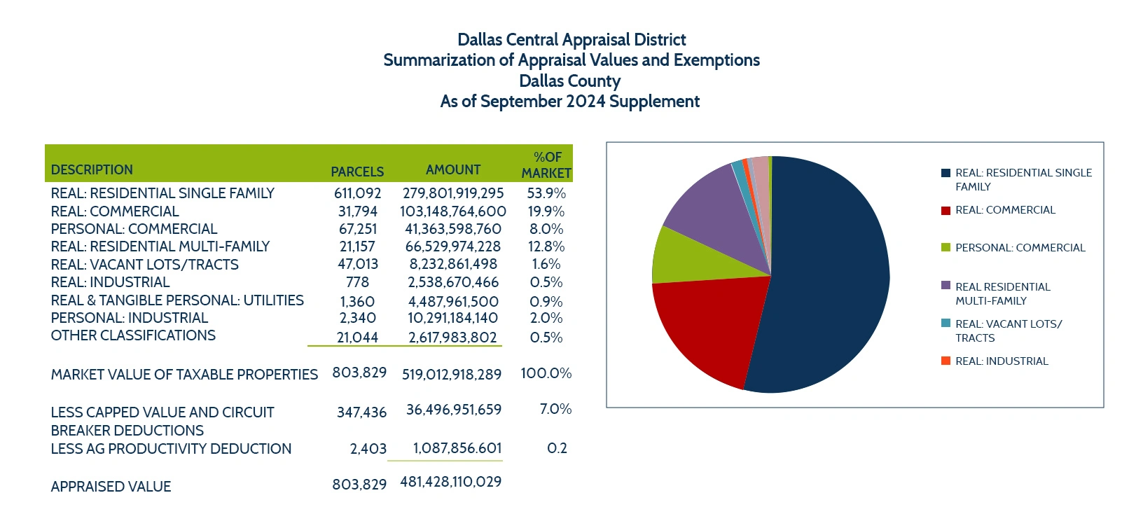 In 2024, the Dallas County Appraisal District Texas appraised approximately 675,898 residential properties, including single-family homes, townhomes, condos, and vacant land, with a total market value of $278 billion.